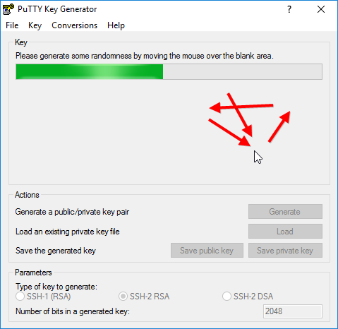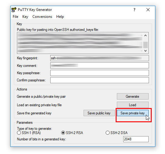 In PuTTY Key Generator, select the type of key, the desired bit length and an optional passphrase, then hit “Generate” to create a public/private key pair.