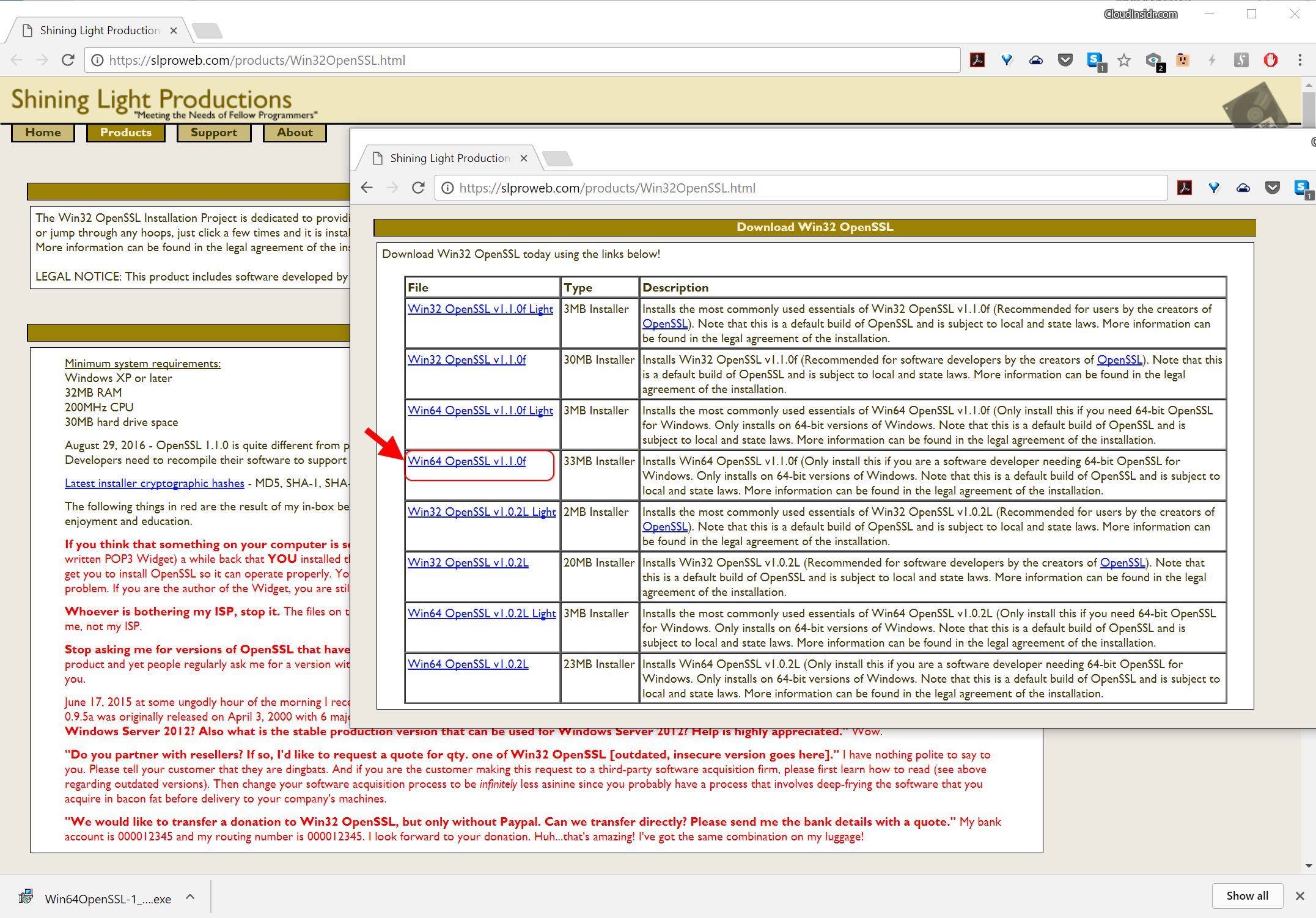 Don’t be fooled by the Win32 string in the URL nor by the navigation pointing you to a seemingly ancient download page from way back in 2004 (from the “Products” tab through the “Win32 OpenSSL link”). Scroll down the page to the section “Download Win32 OpenSSL”, ignoring the confusing string. Now you need to pick the right binary from the list. For each version, there are two basic types: the full installer and the light installer.