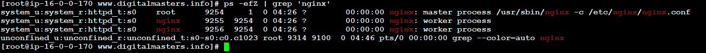 View the current SELinux security context for the NGINX master and worker processes while running